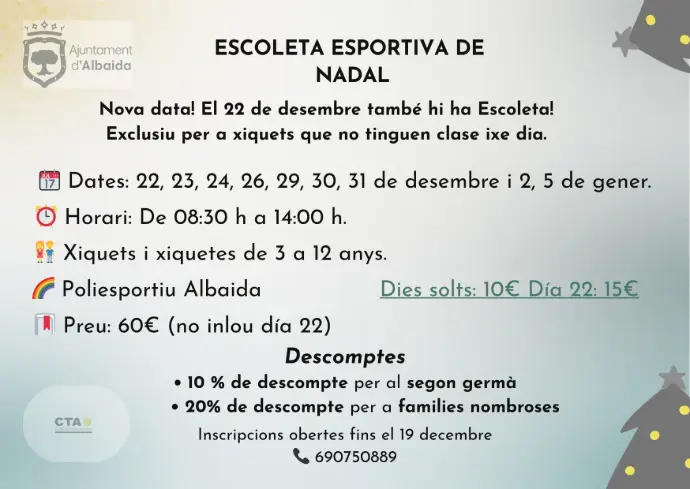 La escoleta de navidad que ofrecemos ha sido concebida con un enfoque integral en el multideporte, con el propósito de atender tanto las necesidades físicas como emocionales de los niños y niñas. Todas las actividades están basadas en juegos y dinámicas adaptadas a su edad y condición física, fomentando así el disfrute, la actividad física y la adquisición de valores a través del deporte y la convivencia.